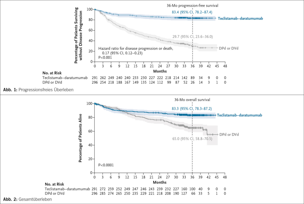 Teclistamab ist ein bispezifischer Antikörper (T-Zell-Stimulator); Daratumumab ein CD38 spezifischer Antikörper. In dieser Studie wurden Patienten mit refraktärem/rezidivierendem Plasmazellmyelom eingeschlossen, die meisten in der zweiten Therapielinie. Sie erhielten die Kombination aus Teclistamab und Daratumumab oder Daratumumab in Kombination mit Pomalidomid und Dexamethason bzw. Bortezomib und Dexamethason, also eine Standard-3er-Kombination. Die Patienten durften nicht Daratumumab-refraktär sein. 587 Patienten wurden randomisiert. 291 bzw. 296 Patienten wurden in die Gruppen Teclistamab-Daratumumab bzw. DPD oder DBD randomisiert. Die Kombination des BCMA-gerichteten bispezifischen Antikörpers war im progressionsfreien Überleben (Abb. 1) hochsignifikant überlegen: Nach 34.5 Monaten betrug die Hazard Ratio 0.17 (95 % CI 0.12–0.23; p < 0.001), das 3-Jahres-PFS betrug 83.4 % gegenüber 29.7 %. Die Rate an kompletter Remission war unter dem experimentellen Arm mit 81.8 % vs. 32.1 % höher und die Rate an MRD-Negativität entsprechend mit 58.4 % vs. 17.1 %. Alle Untergruppen profitierten.
