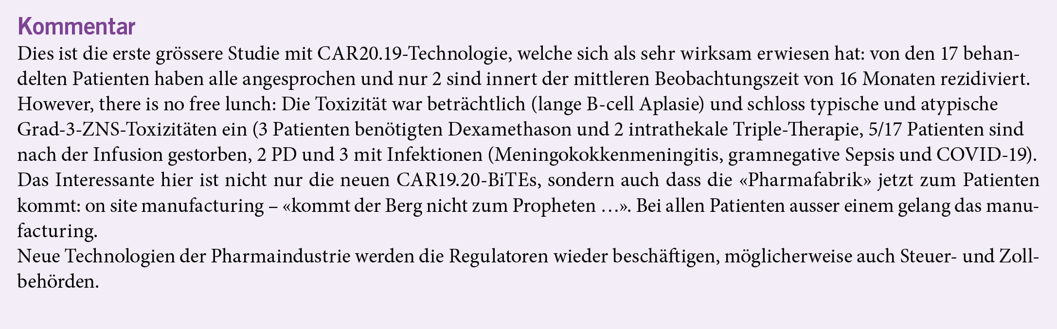 Zusammenfassend konnte gezeigt werden, dass vor Ort adaptiv hergestellte LV20.19-CAR-T-Zellen für R/R-MCL machbar, sicher und wirksam sind. Die beste ORR betrug 100 %, das Sicherheitsprofil war günstig und es kam bisher zu wenigen Rückfällen.