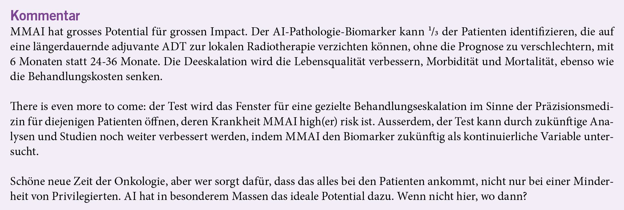 Soweit bekannt ist, ist das MMAI-Modell der erste validierte prädiktive Biomarker zur Bestimmung der Dauer der ADT mit RT bei lokalisiertem/lokal fortgeschrittenem PCa. Ungefähr ein Drittel der Männer mit hochriskantem Prostatakrebs könnte sicher von zusätzlichen 24 Monaten Androgendeprivationstherapie (ADT) und der damit verbundenen Morbidität verschont bleiben.