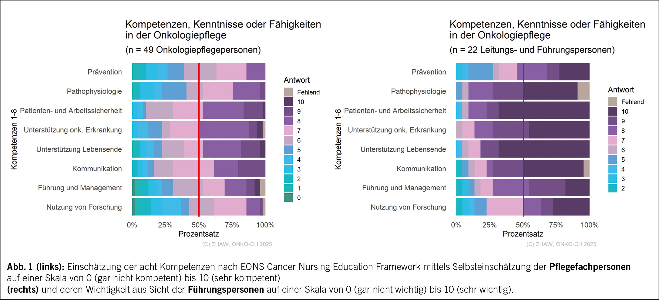 So schätzten bei vier dieser Kompetenzen 50 % der Pflegefachpersonen die eigene Kompetenz auf der gegebenen Skala von 0 (gar nicht kompetent) bis 10 (sehr kompetent) mit einem Wert von sieben oder weniger ein. Bei den anderen vier Kompetenzen schätzten 50 % der Pflegefachpersonen die eigene Kompetenz mit einem Wert von sechs oder weniger ein. Demgegenüber schätzen 50 % der Führungspersonen alle Kompetenzen auf der gegebenen Skala von 0 (gar nicht wichtig) bis 10 (sehr wichtig) mit einem Wert von acht oder höher ein.
