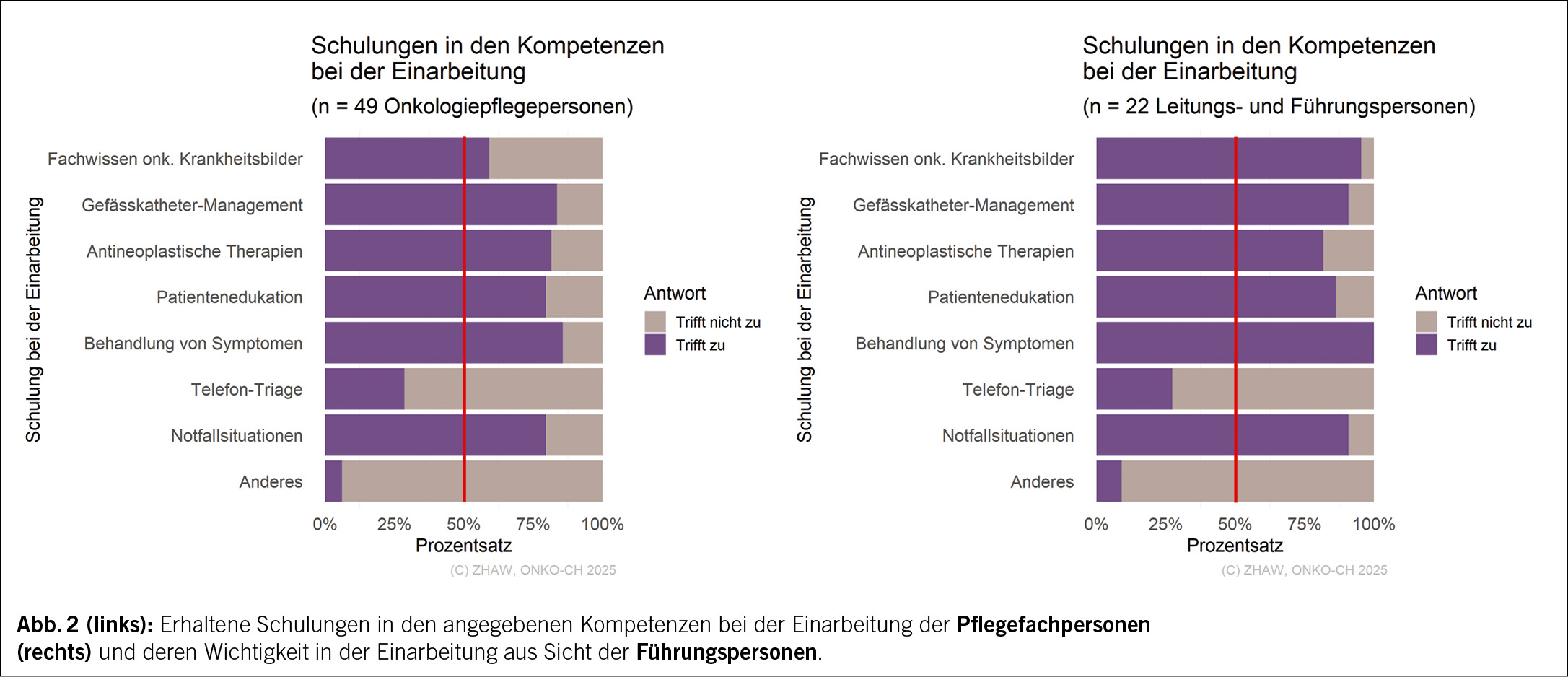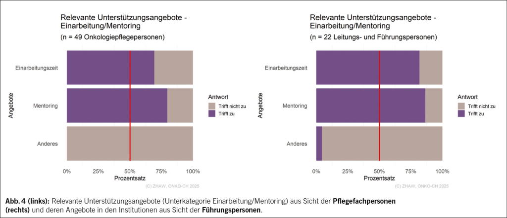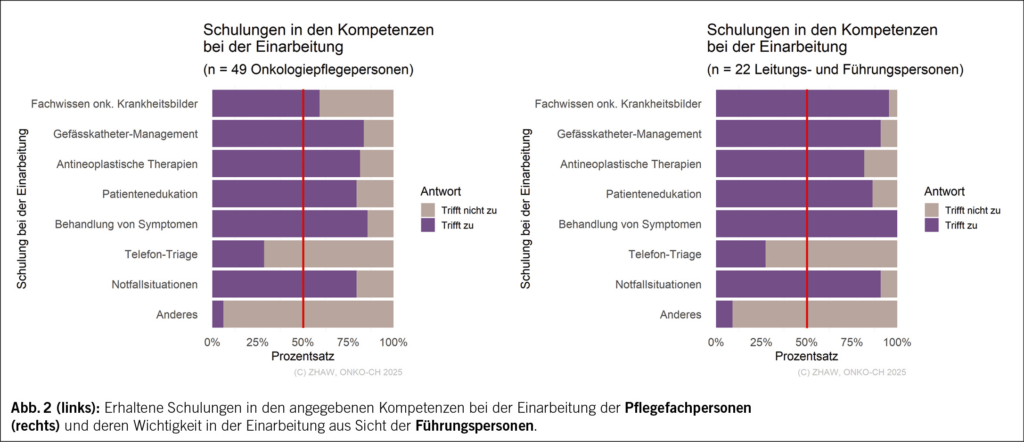 Hiervon ausgenommen sind Schulungen bezüglich «Fachwissens zu den häufigsten onkologischen Krankheitsbildern», welche nur 59 % der Pflegefachpersonen erhielten. Demgegenüber gaben 95 % der Führungspersonen an, auf diese Schulungen innerhalb der Einarbeitung Wert zu legen.