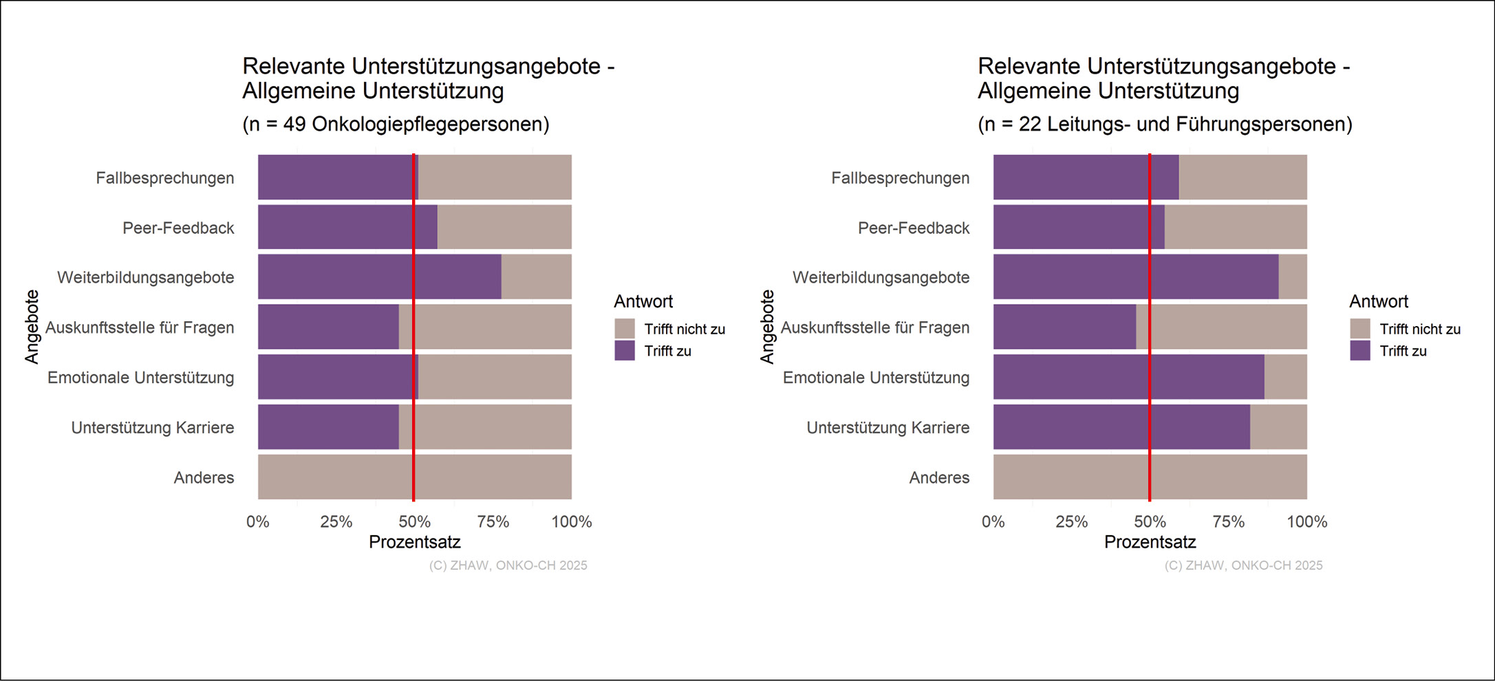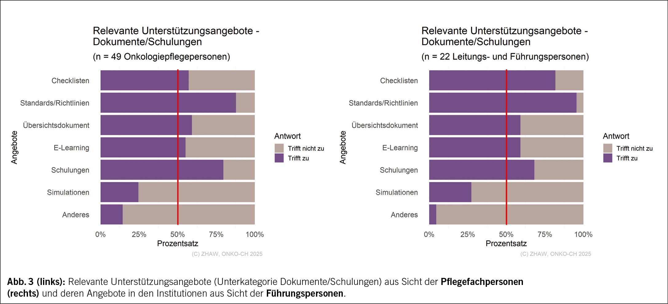 Die Pflegefachpersonen waren mehrheitlich weiblich (n = 46), grösstenteils dipl. Pflegefachfrau/-mann HF/FH (n = 43), meist junge Onkologiepflegefachpersonen (n = 33) und überwiegend im ambulanten Spitalsetting (n = 33) sowie im Bereich Hämato-Onkologie (n = 29) tätig. Die Führungspersonen waren mehrheitlich Stationsleitungen (n = 13), mehrheitlich im ambulanten Spitalsetting (n = 33) tätig und verfügten über 1–21 Jahre an Führungserfahrung.