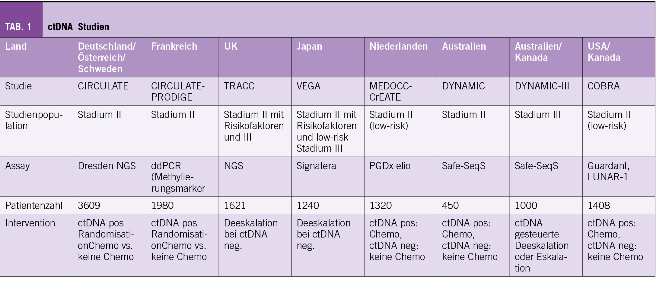 In vielen Ländern laufen derzeit Studien mit der Fragestellung bzgl. De-Eskalation aber teils auch mit der Frage nach Intensivierung der Behandlung gesteuert anhand von ctDNA-Analysen, teils im Stadium II, teils im Stadium III und teilweise auch kombiniert und auch Studien, welche Rektumkarzinompatienten einschliessen (Tab. 1).