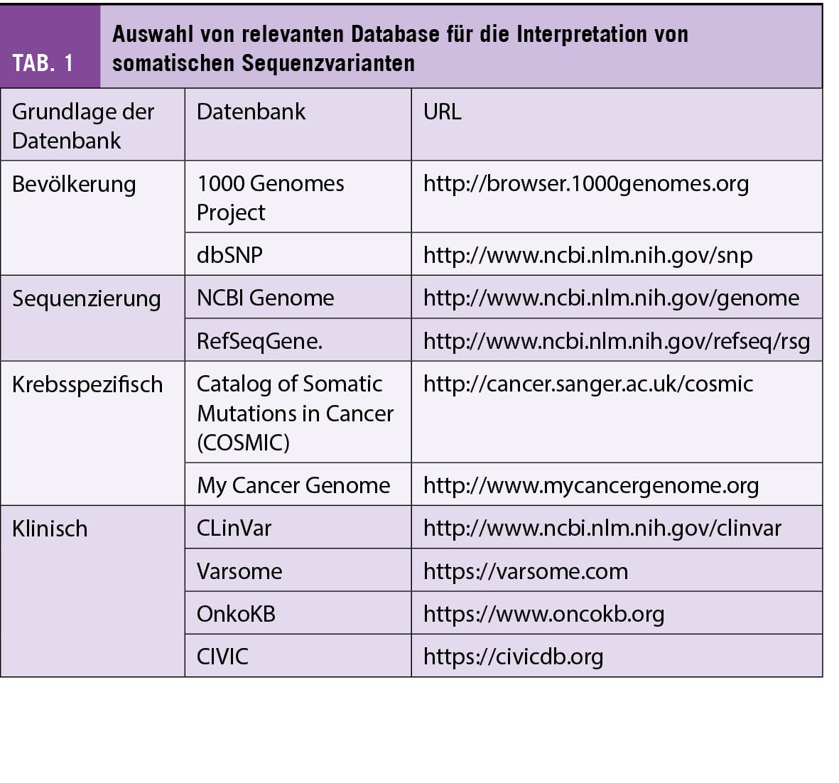 Die Auswirkung einer Mutation auf die biologischen und funktionellen Eigenschaften eines Proteins bestimmt die Pathogenität. Bei der Auswertung der Pathogenität werden unter anderem Kriterien wie Häufigkeit der Mutation in der Population, ihre evolutionäre Konservierung, ihr Einfluss auf die Proteinstruktur und –funktion berücksichtigt. Für die Analyse stehen eine Vielfalt an öffentlichen, privaten oder kommerziellen Databanken und «In-silico»-Tools zur Verfügung (Tab. 1). Der Einbezug eines Bioinformatikers ist allgemein empfohlen, aber vor allem bei der Auswertung von komplexeren Varianten indiziert. Basierend auf den Ergebnissen erfolgt die Einteilung nach der international anerkannten American College of Medical Genetics and Genomics (ACMG) Klassifikation in (i) pathogen, (ii) wahrscheinlich pathogen, (iii) ungewisse Bedeutung, (iv) wahrscheinlich gutartig, oder (v) gutartig (5, 6). Lediglich die Varianten die als pathogen oder wahrscheinlich pathogen klassifiziert werden, sind auch als therapierelevant einzuschätzen. Solche Varianten müssten in jedem molekular-pathologischen Bericht aufgeführt werden.