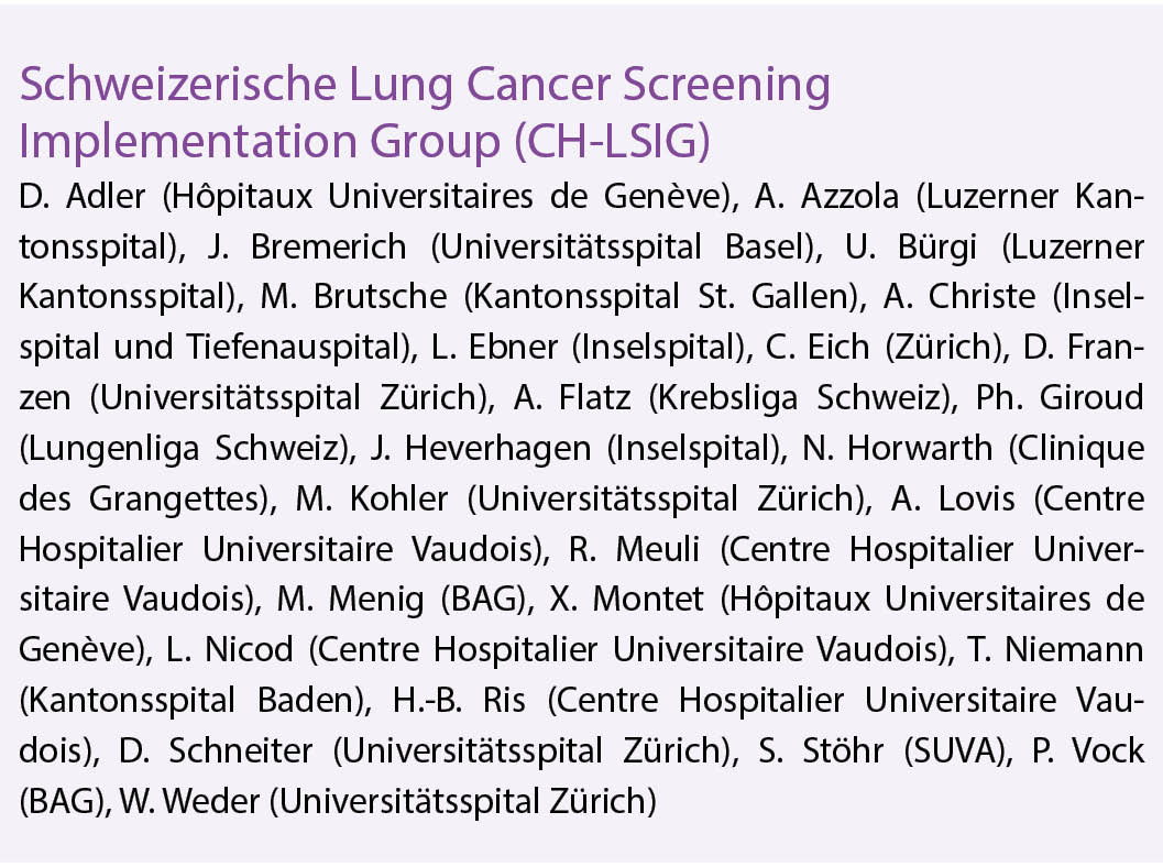 Die CH-LSIG, hat in einem Statement über LDCT-Lungenkrebsscreening die grundlegenden Anforderungen eines zukünftigen Früherkennungsprogramms festgehalten (7). In diesem Statement wird von 300 000 Frauen und Männern in der Schweiz ausgegangen, welche als Risiko-Zielgruppe potenziell für ein LDCT-Screening qualifizieren würden. Aufgrund der geographischen Verteilung von Dienstleistern und Zentren des Gesundheitswesens, welche ein Screening anbieten könnten, als auch der elektiven Natur der Untersuchung, kommt die Expertengruppe zum Schluss, dass ein landesweites Screening-Programm durchführbar wäre.