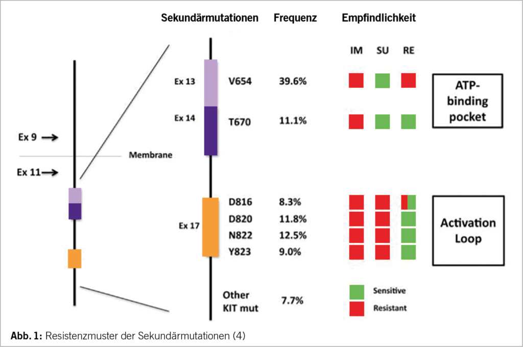 Die Zeit, in der die GIST-Erkrankung unter Imatinib gut kontrolliert ist, ist bemerkenswert lang; bei Patienten mit einer Exon 11 Mutation sind es an die 2 Jahre. Das PFS der darauffolgenden Substanzen wie Sunitinib, Regorafenib und Repretinib ist mit 4-7 Monaten dagegen relativ kurz. Daher kommt der Entwicklung der Imatinib-Resistenz eine klinisch entscheidende Bedeutung zu. Den Mechanismus der Imatinibresistenz verstehen wir heutzutage gut; die im Rahmen der Imatinib-Resistenz entstandenen Mutationen befinden sich nicht einfach irgendwo im c-KIT- oder PDGFRA-Gen, sondern an ganz spezifischen Stellen. Was das c-KIT Gen anbelangt, treten diese sogenannten Sekundärmutationen typischerweise im Exon 13, 14 oder 17, 18 auf (3). Die nach Imatinibversagen verwendeten Substanzen Sunitinb, Regorafenib und Repretinib weisen unterschiedliche Empfindlichkeiten/Resistenzen gegenüber den jeweiligen Sekundärmutationen auf (4) (Tab. 1).