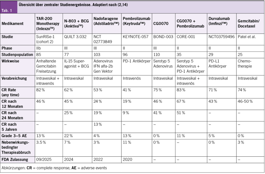- Eine Vielzahl innovativer intravesikaler Immun- und Chemotherapien befindet sich in unterschiedlichen Stadien der klinischen Prüfung. Dazu zählen virale Gentherapien wie Nadofaragen-Firadenovec und CG0070, Immunmodulatoren wie N-803 sowie kombinierte Chemotherapeutika wie Gemcitabin/Docetaxel.
