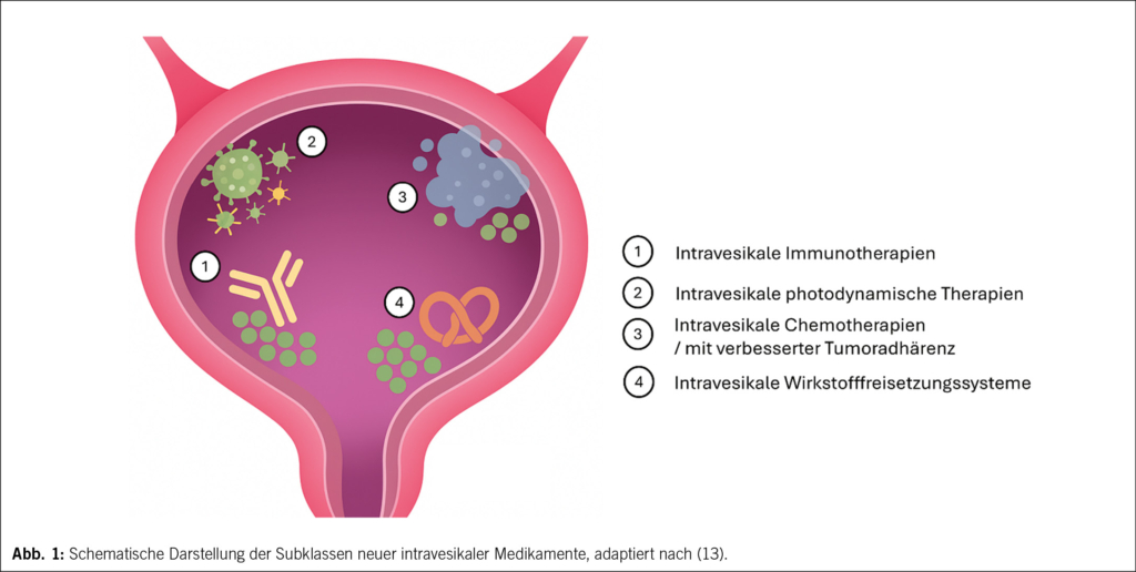 Im Folgenden werden vielversprechende therapeutische Ansätze vorgestellt, die das Management des NMIBC revolutionieren können. Eine Übersicht zentraler Studienergebnisse findet sich in Tabelle 1. Eine schematische Darstellung der Subklassen neuer intravesikaler Medikamente bietet Abbildung 1.