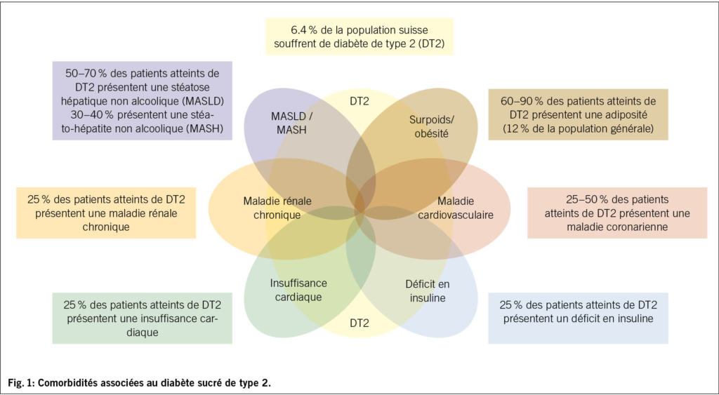 La charge des comorbidités est particulièrement élevée chez les personnes atteintes de DT2. En Suisse, 6.4 % de la population est touchée, dont 60 à 90 % souffrent d’obésité, alors que ce n’est qu’environ 12 % dans la population générale. Environ un quart des patient/es atteints de diabète de type 2 présentent une maladie cardiovasculaire, et autant souffrent d’un déficit en insuline. De 50 et 70 % développent une stéatose hépatique associée à un dysfonctionnement métabolique (MASLD),et 30–40 % une MASH, et environ 25 % souffrent d’insuffisance cardiaque. L’obésité sans diabète s’accompagne également d’une charge de morbidité élevée. Plus de 1.1 milliards de personnes sont touchées dans le monde, dont jusqu’à 25 % développent en plus un DT2, près de la moitié une apnée du sommeil, plus de la moitié une hypertension et plus des deux tiers une dyslipidémie (Fig. 1).