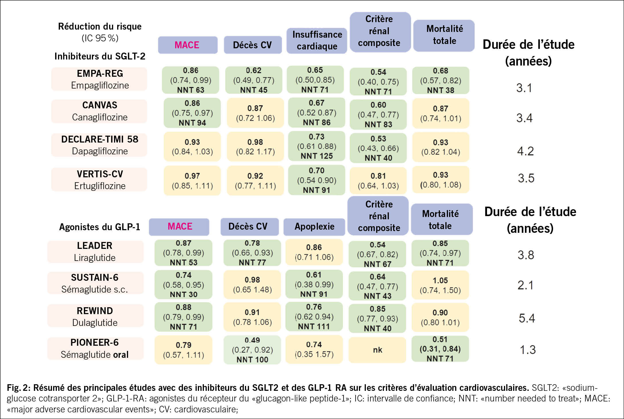 La première étude ayant démontré un bénéfice clair était EMPA-REG OUTCOME: l’empagliflozine a réduit le risque de MACE à 3 points de 14 %, la mortalité cardiovasculaire de 38 %, les hospitalisations pour insuffisance cardiaque de 35 % et la mortalité globale de 32 %. L’étude LEADER a fourni la première preuve d’efficacité d’un agoniste du récepteur du GLP-1. Le liraglutide a réduit la mortalité cardiovasculaire de 22 % et la mortalité globale de 15 %. D’autres études, telles que SUSTAIN-6 (semaglutide) et REWIND (dulaglutide), ont confirmé ces résultats (Fig. 2). Des études plus récentes ont élargi le spectre. L’étude SELECT a montré une réduction relative de 20 % du risque du MACE à 3 points sous semaglutide chez les patients en surpoids atteints d’une maladie cardiovasculaire, mais sans diabète. L’étude SOUL avec le semaglutide par voie orale a montré une réduction significative de 14 % du MACE chez plus de 9600 patients atteints de diabète de type 2 et de maladies cardiovasculaires ou de MRC. L’essai FLOW a démontré pour la première fois un avantage pour un agoniste des récepteurs du GLP-1 chez les patients atteints de diabète de type 2 et d’insuffisance rénale chronique, avec une réduction de 27 % des événements d’insuffisance cardiaque et de mortalité cardiovasculaire.