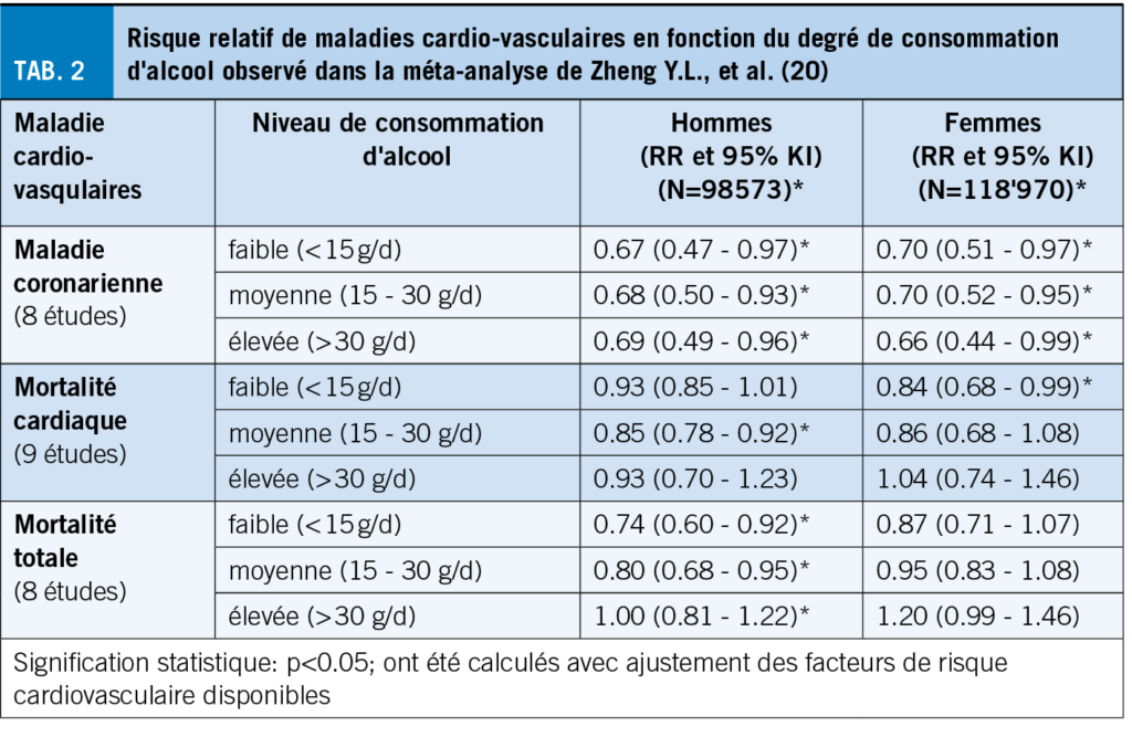 Le tableau 1 résume aussi les données relatives à l’incidence et à la mortalité CV, dans leur ensemble, qui ont été rapportées dans les 4 métanalyses ayant inclus entre 7 et 15 études de cohorte totalisant plus d’un million de personnes à prédominance masculine. Ce tableau montre qu’une consommation légère à modérée ou modérée d’alcool est associée à une réduction significative du RR de morbidité et mortalité CV oscillant entre 0.68 et 0.85 chez les hommes et dans le collectif entier inclus dans 3 des 4 métanalyses [19, 21, 27], alors que chez les femmes, l’abaissement des RR n’atteint le seuil de signification statistique que dans l’une des 4 métanalyses (0.63; 0.57-0.71) [24].