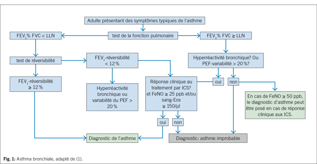 L’ asthme apparaît souvent de manière soudaine, souvent dès l’ enfance ou l’ adolescence, et est associé à des allergies. La BPCO se développe progressivement, généralement à un âge avancé, presque toujours chez les fumeurs. Ces maladies se distinguent par leurs symptômes, leur physiopathologie et leur réponse au traitement. L’ asthme réagit généralement bien aux stéroïdes inhalés, contrairement à la BPCO. La présence d’ éosinophiles dans le sang peut accompagner les deux pathologies et constitue un marqueur de la réussite du traitement. Pour les médecins généralistes, l’ asthme doit être diagnostiqué lorsque les symptômes sont associés à au moins l’ un des critères suivants: obstruction réversible, variabilité du DEP, réponse au traitement avec éosinophilie > 150/µl ou combinaisons de ces critères (algorithme, voir Fig. 1).