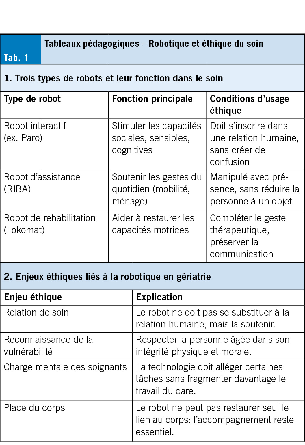 In a context of demographic ageing and a shortage of healthcare staff, robotics is emerging in geriatric institutions as a potential solution to support caregiving work. This article explores this new paradigm through the lens of care ethics, as defined by Joan Tronto. Rather than opposing technology and humanity, it invites us to consider robots not as substitutes, but as potential peripheral tools of care–provided they are integrated into a relational dynamic that respects the vulnerability of both patients and caregivers. Three concrete examples (interactive, physical assistance, and rehabilitation robots) serve to examine the benefits, limitations, and ethical conditions for their use.