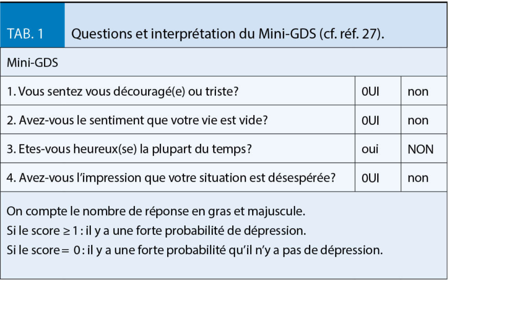 Moral  : Une dépression préopératoire augmente le risque d’  état confusionnel après un pontage aorto-coronarien d’  un facteur 10 (Adj OR 9.92; 95 % CI : 1.26-77.88)(24), et double le risque de décès (Adj HR 2.37; 95  % CI : 1.40-4.00; p  = 0.001) (25). Le risque de mortalité après un changement de valve aortique (chirurgical et TAVR) est également augmenté en cas de dépression, tant à 1 mois (OR 2.20; 95   %CI : 1.18-4.20) qu’  à 12 mois (OR 1.53; 95   % CI : 1.03-2.24) (26). Un outil de dépistage simple et rapide pour évaluer la présence d’  une dépression est le miniGDS à 4 items (27) qui est positif si score ≥   1 (tab.  1). En cas de suspicion de dépression ou d’  anxiété quant à l’  intervention, une préparation psychologique pourrait être bénéfique (28), même si les modalités d’  une telle intervention et les données de la littérature sont encore lacunaires (29).