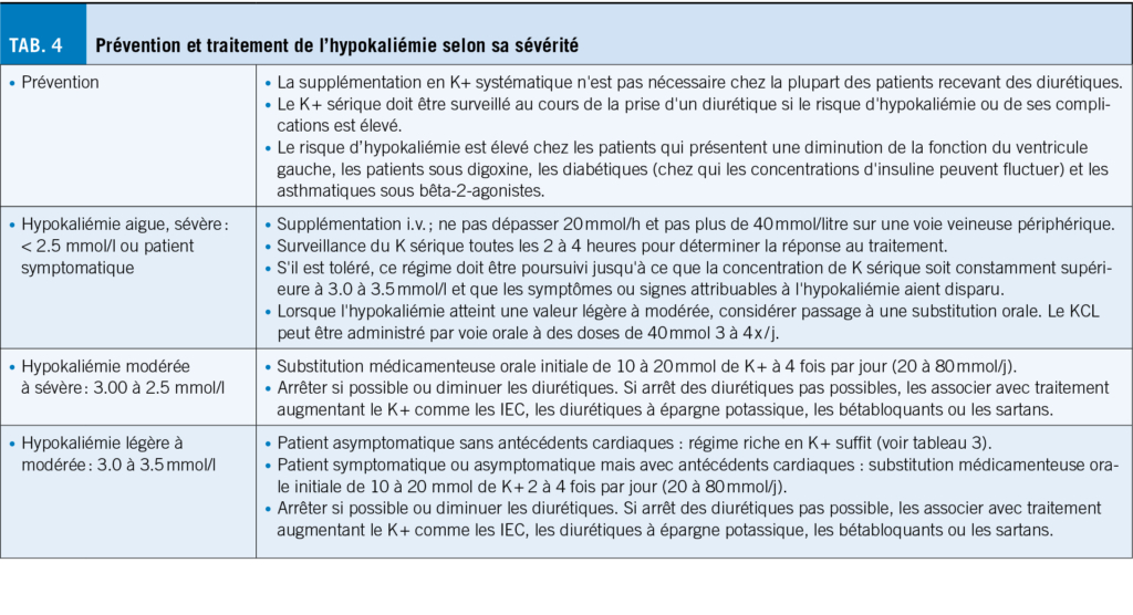 La vitesse de correction d’ une hypokaliémie dépend de sa sévérité, de la clinique et des comorbidités du patient (tab. 4). On peut résumer les grandes lignes de prise en charge :