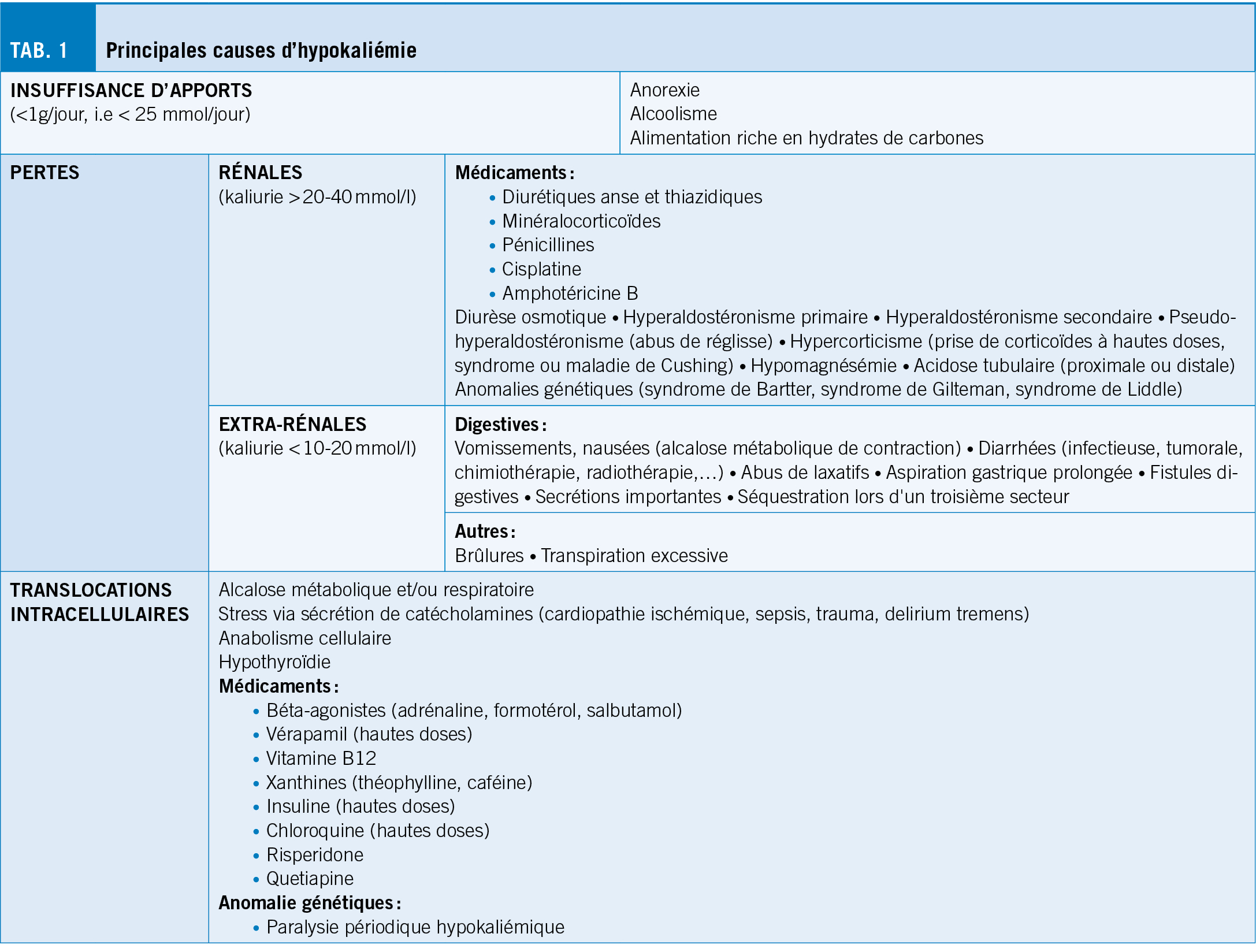 Les causes de l’ hypokaliémie peuvent être classées en 3 catégories (tab. 1).