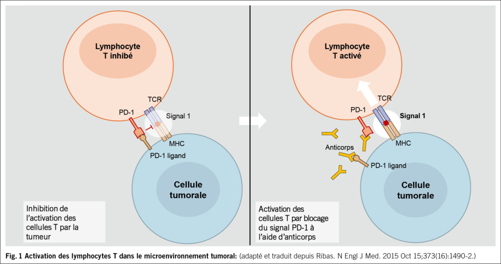 Prenons l’exemple de l’interaction entre PD-1, exprimé à la surface des lymphocytes T, et PD-L1, exprimé par les cellules tumorales: cette interaction inhibe le lymphocyte, l’empêchant d’exercer son effet cytotoxique anti-tumoral. Le cancer, notamment via une surexpression de PD-L1, parvient ainsi à échapper à la réponse immunitaire et à poursuivre sa progression. Ce mécanisme est illustré dans la Fig. 1.