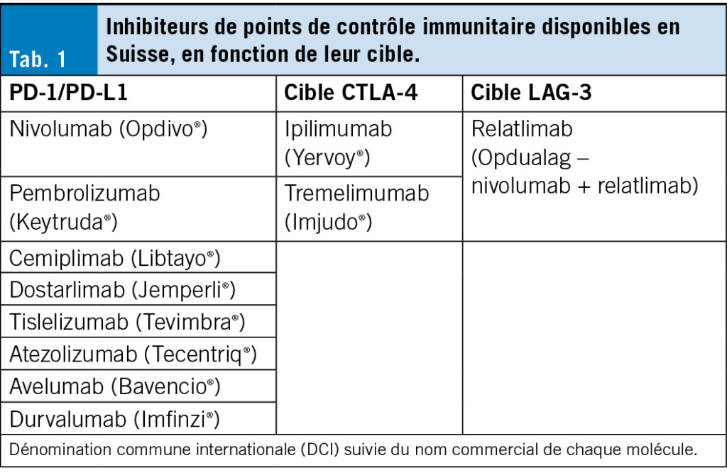 Parmi ces points de contrôle, ceux qui ont révolutionné l’oncologie sont principalement l’interaction entre PD-1 et PD-L1, ainsi que celle entre CTLA-4 et les cellules présentatrices d’antigènes (2). D’autres points de contrôle, comme LAG-3, TIGIT ou TIM-3, font l’objet de développements récents, mais ne seront pas abordés dans ce manuscrit (3). La Tab. 1 décrit le nom des molécules, et leur cible, disponibles en Suisse.