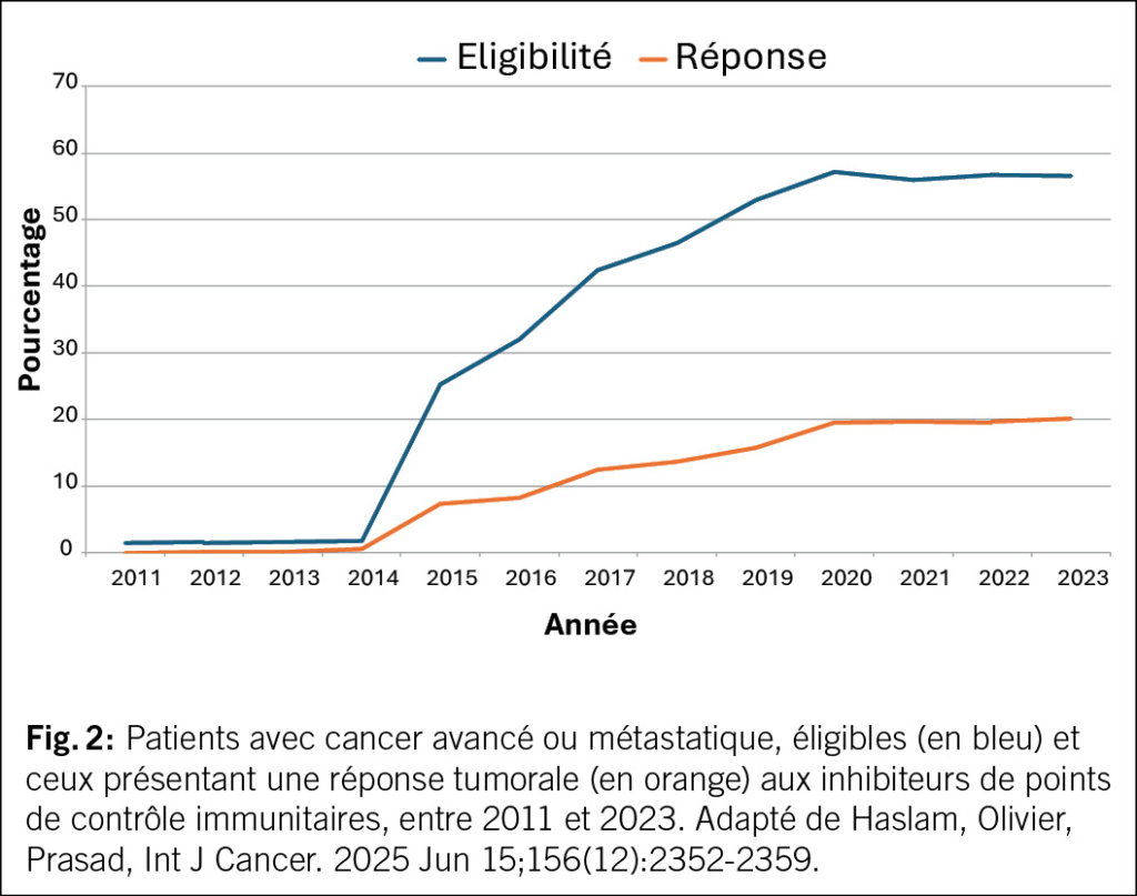 L’exemple du mélanome illustre également les limites de l’immunothérapie: il s’agit d’un cancer relativement rare, en situation avancée, comparé à d’autres. Cela explique qu’à ce jour, si l’on tient compte de la fréquence de chaque type de cancer, seulement environ 20 % des patients atteints de maladie avancée bénéficient d’une réponse tumorale à l’immunothérapie (8). De plus, seule une fraction de ces patients va avoir un bénéfice durable dans le temps. L’évolution au cours du temps du nombre de patients avec maladie avancée ou métastatique étant éligible, c’est à dire avec une indication à recevoir la thérapie, et ceux présentant une réponse tumorale, est représenté dans la Fig. 2. En d’autres termes, bien que l’immunothérapie représente une révolution pour certains patients, elle ne bénéficie encore qu’à une minorité des personnes atteintes de maladie avancée.