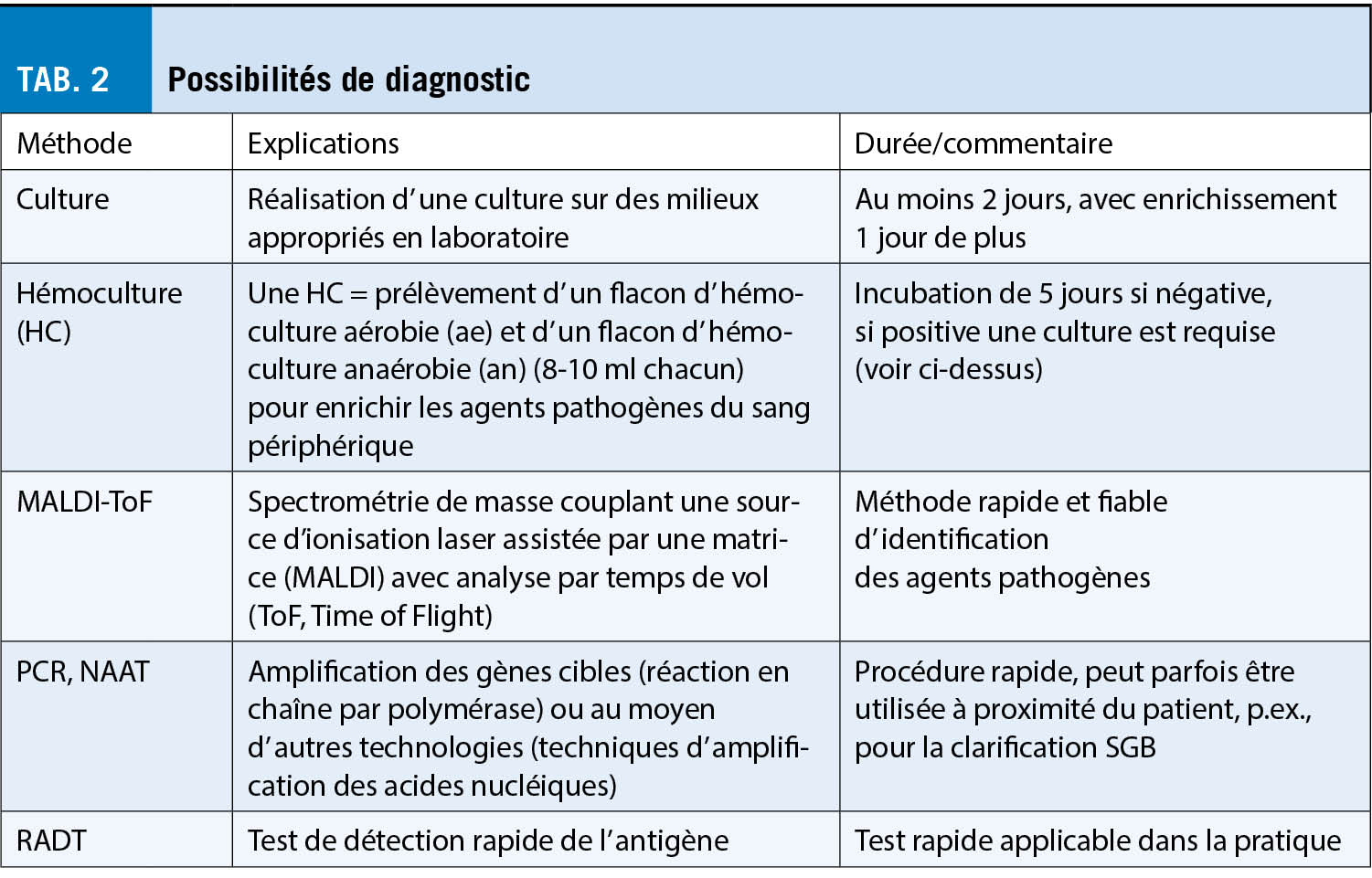 Dans les directives, le système d’ évaluation clinique selon Centor (CSS) ou McIsaac (MSS), les tests de détection rapide de l’ antigène (RADT) et la culture d’ enrichissement classique sont discutés pour le diagnostic du GAS-ATP (tab. 2). La détection par NAAT/PCR ne semble pas adéquate compte tenu des coûts comparativement élevés (7). Les méthodes de détection sérologique – à l’ exception de l’ exclusion de la nécrose aiguë de la rétine (ARN) et des fimbriae agrégatives (AGF) – n’ ont pas de rôle en clinique.
