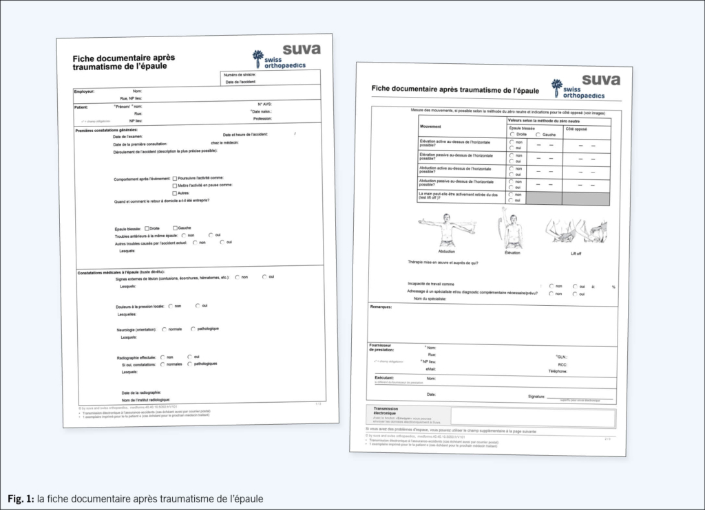 • Afin de standardiser la saisie initiale, le groupe d’experts épaule et coude de Swiss Orthopaedics et la Suva ont élaboré conjointement une fiche documentaire après traumatisme de l’épaule, qui est désormais à la disposition des premiers médecins traitants.