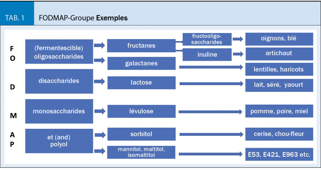 Les différents FODMAP, illustrés avec des exemples, sont disposés dans la (fig. 1).