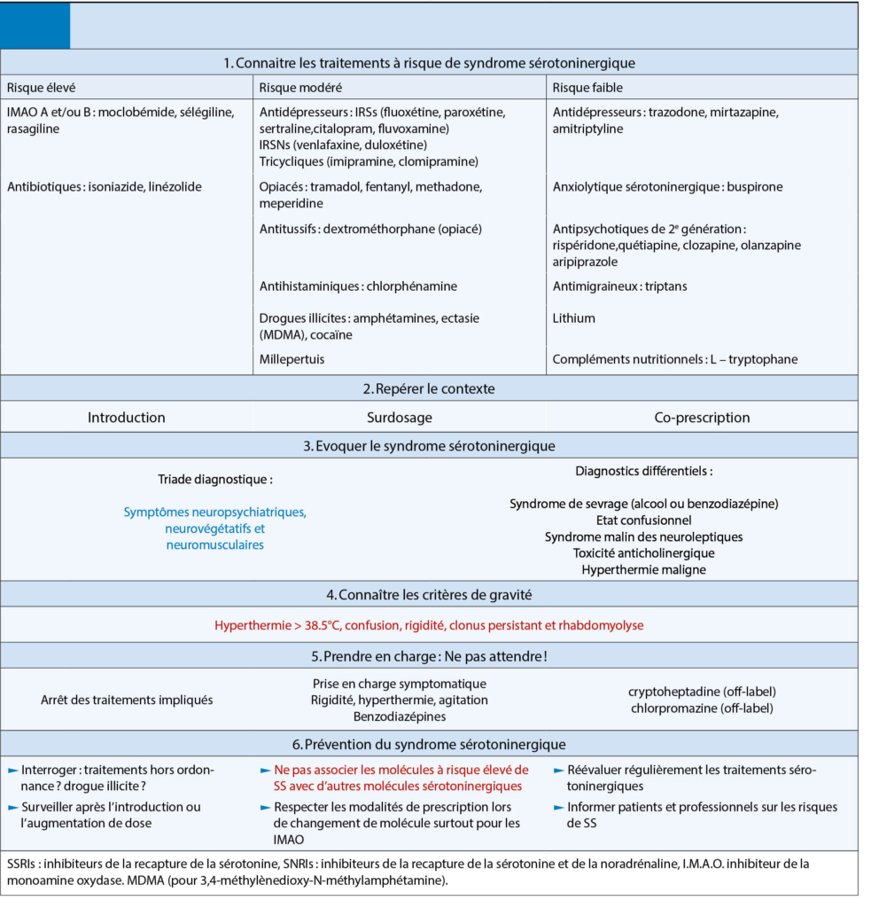 Le syndrome sérotoninergique, également appelé toxicité sérotoninergique, associe des symptômes neurocognitifs, neuromusculaires et neurovégétatifs. La présentation clinique varie de formes très légères à des formes sévères et potentiellement létales. La toxicité sérotoninergique devient plus fréquente en raison de la prescription croissante de médicaments sérotoninergiques, principalement des antidépresseurs et des analgésiques. La prévention est essentielle. Elle passe par la formation des patients et des prescripteurs pour éviter ou détecter la toxicité sérotoninergique.