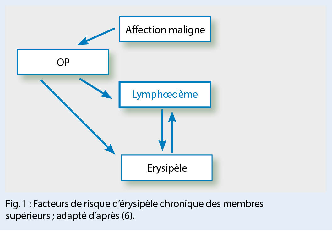 Une barrière cutanée perturbée, comme dans la dermatite de stase, une onychomycose et la dermatomyosite, peut constituer un point d’ entrée pour une récidive de l’ érysipèle. Les lésions facilitent l’ invasion bactérienne des tissus (3). Le facteur prédictif le plus important de récidive de l’ érysipèle est la présence d’ un lymphœdème chronique (1). Des érysipèles à répétition entraînent des lésions progressives et irréversibles des vaisseaux lymphatiques. L’ œdème riche en sérum qui en résulte constitue donc un risque supplémentaire de récidive. Les troubles du flux lymphatique peuvent aussi être causés par des lésions des vaisseaux lymphatiques dues à des infections, une radiothérapie et des interventions chirurgicales. Ces dernières comprennent, par exemple, la lymphadénectomie en cas de maladie tumorale et la saphénectomie en cas de pontage. En outre, la neuropathie chez les diabétiques, l’ insuffisance veineuse chronique et l’ obésité sont également des facteurs de risque. En particulier, le diabète sucré est considéré comme un facteur favorisant la fasciite nécrosante (4). Très rarement, des immunodéficiences primaires peuvent contribuer à la pathogenèse de l’ érysipèle récurrent. En fin de compte, le lymphœdème reste le facteur déterminant pour le développement d’ un érysipèle récurrent (fig. 1).