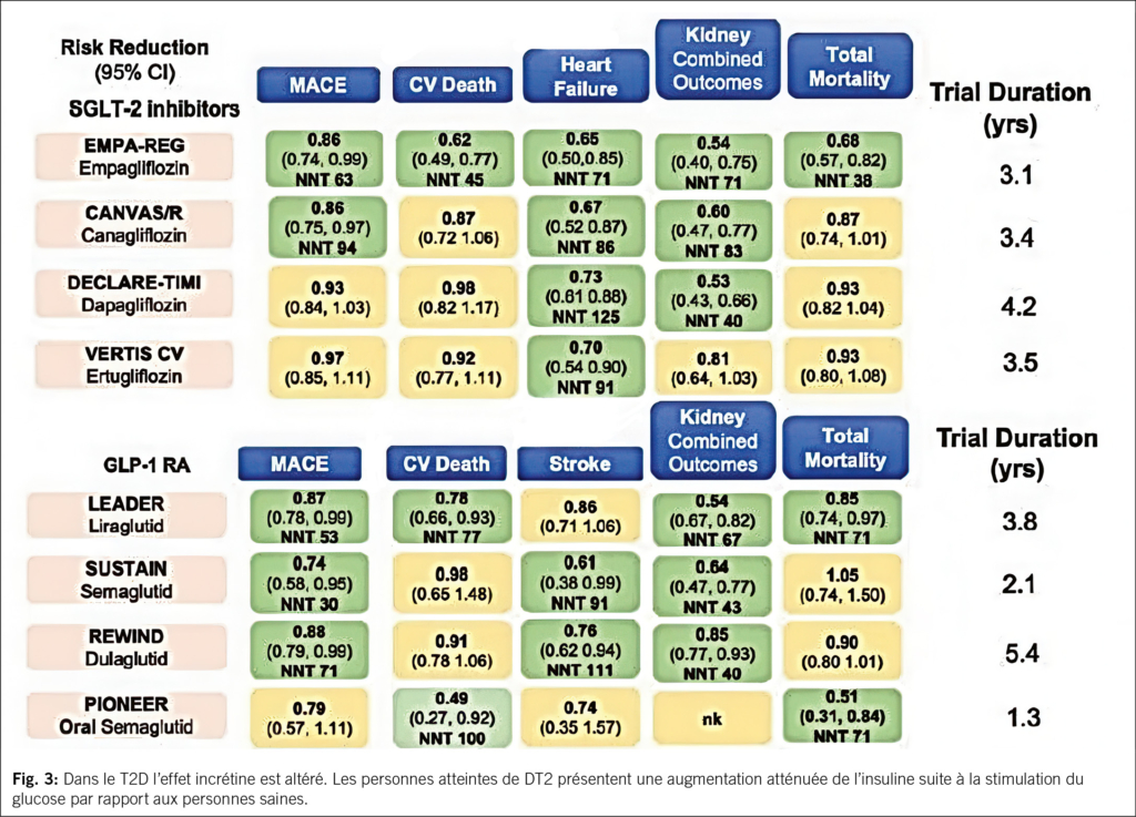 Les tableaux suivants montrent les différents médicaments et les outcomes avec les inhibiteurs de SGLT2 et les agonistes du récepteur GLP-1 (Fig. 2, Fig. 3).