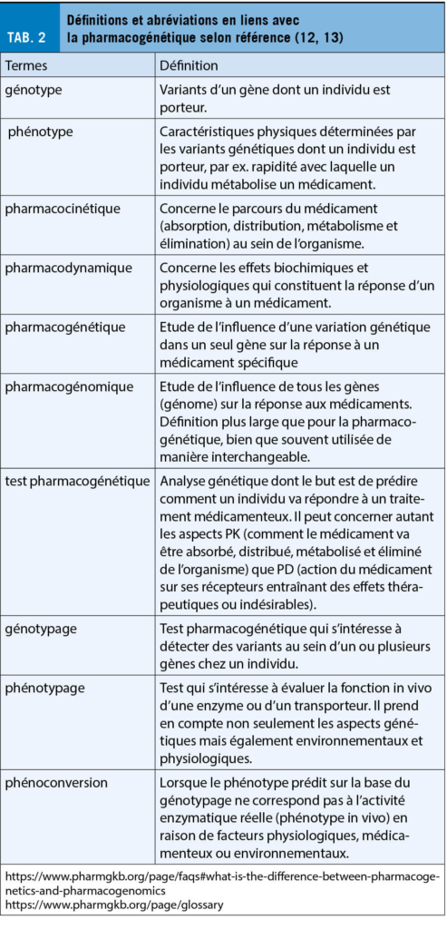En cas de phénoconversion, les examens pharmacogénétiques appelés génotypage (cf. Tab. 2), qui consistent en la recherche de polymorphismes génétiques sur la base d’ un prélèvement sanguin ou salivaire, ne permettent plus de prédire l’ activité enzymatique réelle (le phénotype). Seule une mesure in vivo de l’ activité enzymatique ou du transport au moyen d’ une procédure nommée « phénotypage » permet de prendre en compte tous les facteurs, qu’ ils soient génétiques, physiologiques, environnementaux ou médicamenteux, qui influencent leur fonction à un moment précis (14, 15).