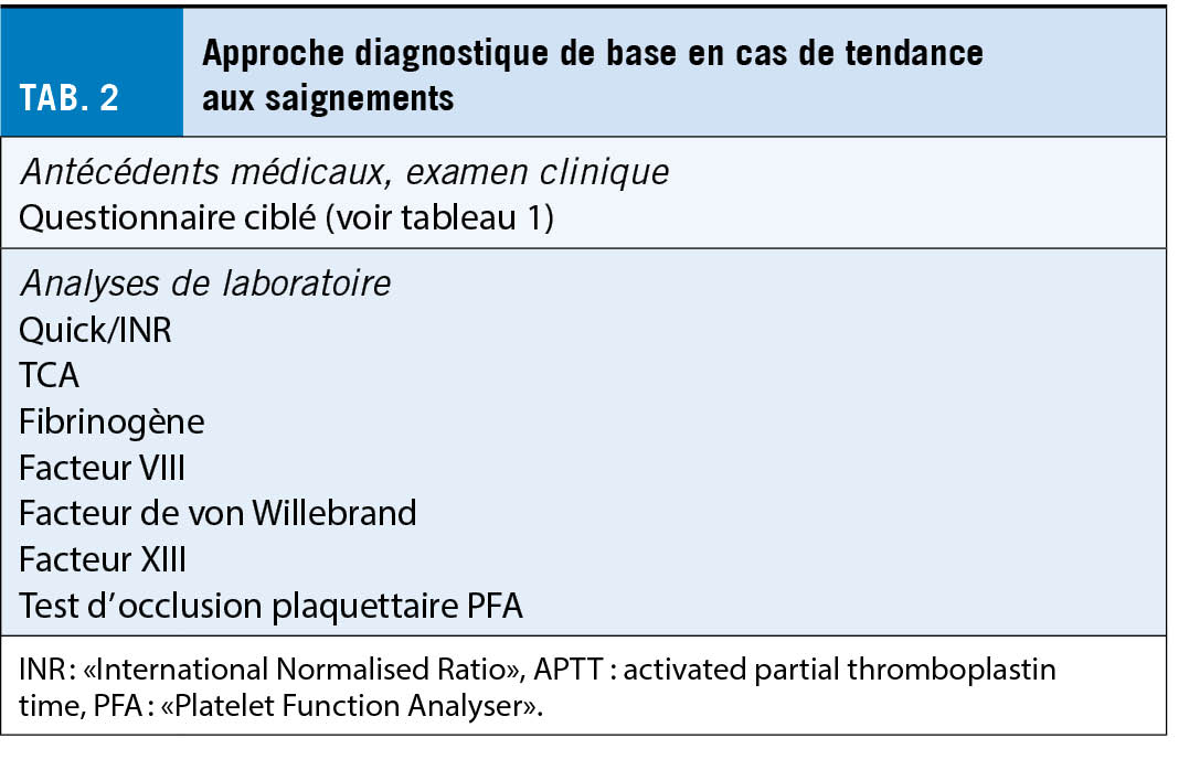 Un historique spécifique et détaillé des saignements est très utile. Comme les patients omettent souvent des épisodes isolés de saignement, ils doivent être interrogés de manière ciblée avant toute intervention diagnostique ou thérapeutique (tab. 1). Par exemple, des saignements menstruels abondants depuis la ménarche nécessitent une clarification pour la maladie de von Willebrand. Plus le taux du facteur de von Willebrand est faible, plus la tendance aux saignements est forte. Des questionnaires structurés au sens d’ un score, comme le score de détection des saignements BAT-ISTH de la Société Internationale sur la Thrombose et l’ Hémostase ISTH, peuvent également être utiles.