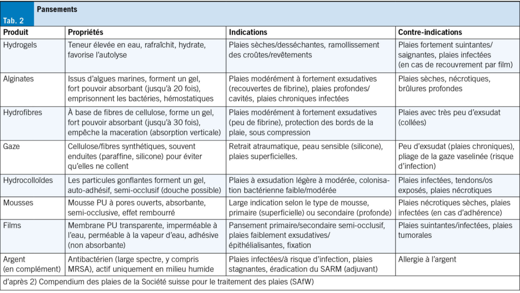Le contrôle de l’infection, la gestion des exsudats et la promotion de l’épithélialisation peuvent être considérablement facilités par le choix approprié d’un pansement. La multitude de pansements disponibles sur le marché est impressionnante, ce qui indique qu’il n’existe pas de «meilleur» pansement. Selon la situation de la plaie, on utilise des pansements en mousse, des alginates, des hydrogels, des hydrocolloïdes ou des pansements antimicrobiens (p. ex. à base d’argent ou d’iode). Le choix dépend du stade de la plaie et de la quantité d’exsudat (Tab. 2).
